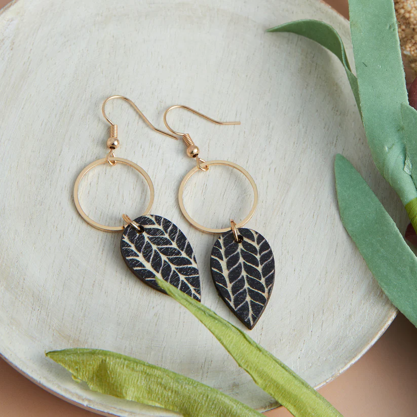 DESCRIPTION: Add a bit of artistic flair to your look with the Wooden Leaf Earrings. Featuring casted rings with dangling wooden charms cut into a leaf shape with cute leaf pattern printed onto them, these lightweight earrings definitely make a statement.