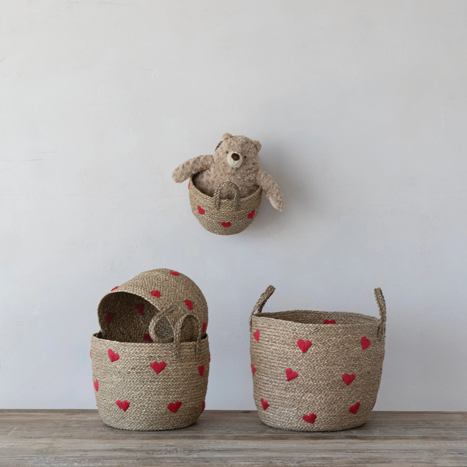 DESCRIPTION: Add an adorable touch to your home decor or create a gorgeous gfit basket with these beautiful Hand-Woven Seagrass Baskets with Hearts. Each basket has 2 handles. Choose between 4 sizes!