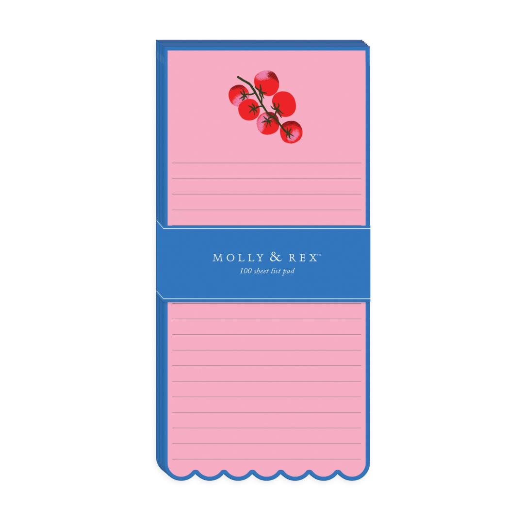 DESCRIPTION: Make lists in style with this bright and colorful Mediterranea Tomatoes Magnetic Notepad! Featuring a beautiful bright pink background, blue border, and scalloped edge at the bottom + an adorable illustration of tomatoes at the top. Great for grocery lists, jotting down ideas, vacation planning, and so much more!