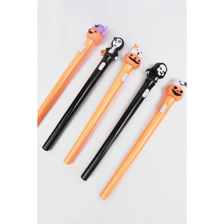 DESCRIPTION: Light Up Halloween Theme Pen Set  -5 Styles Pen Assorted. Available in 5 styles: Bat, Skeleton, Red-Eye Ghost, Bear, and Cat.