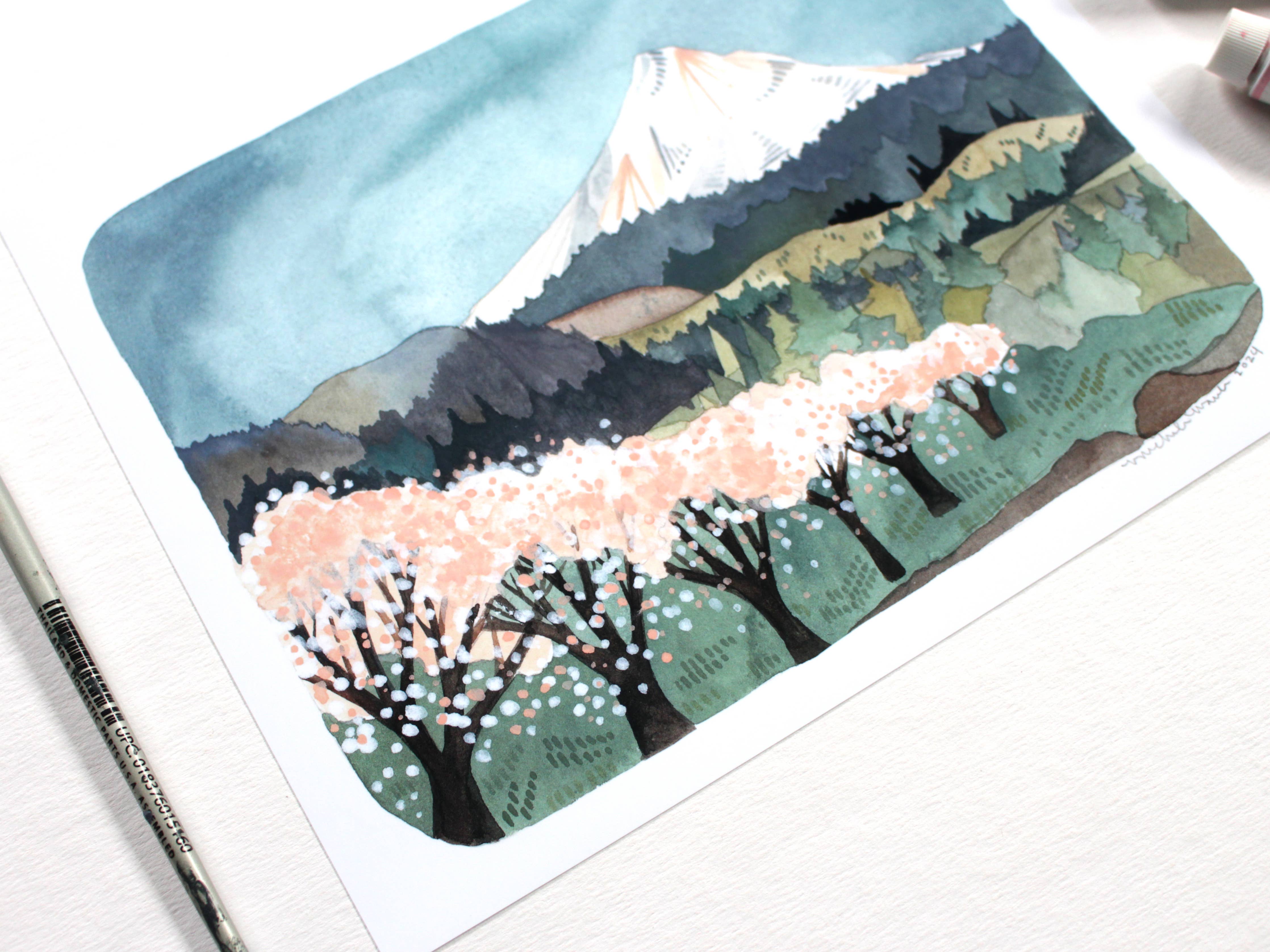 DESCRIPTION: This is a print of an original Michele Maule watercolor painting of the fruit loop located near Hood River, Oregon.