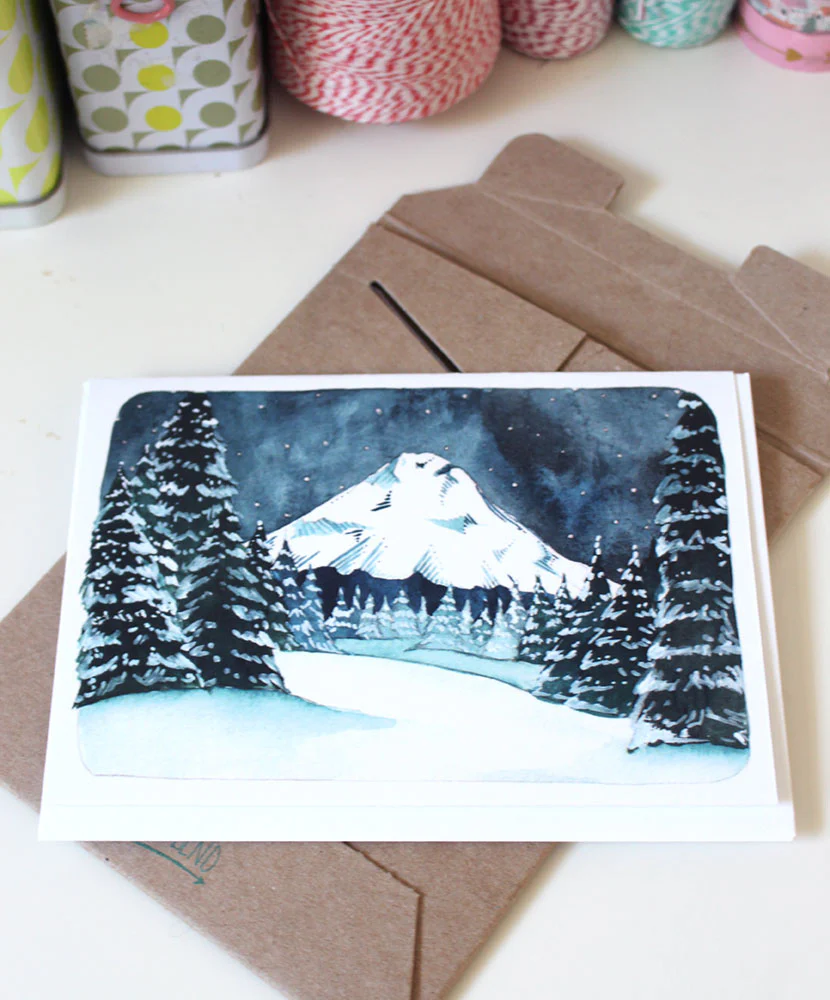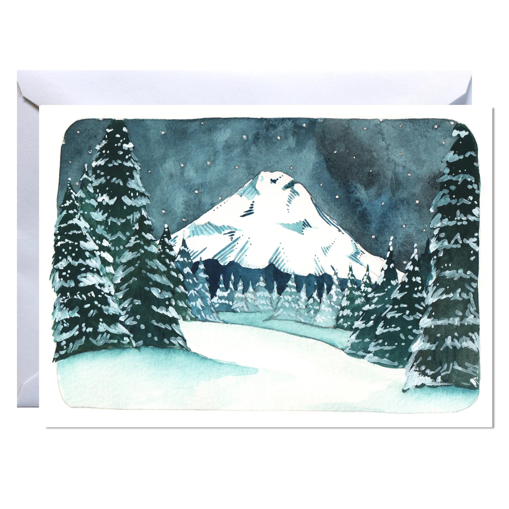 DESCRIPTION: Oregon's own Mt Hood greeting card. It's blank on the inside, perfect for a personal message. Printed on 100 card stock paper. They come packaged in a clear plastic sleeve with a white envelope.