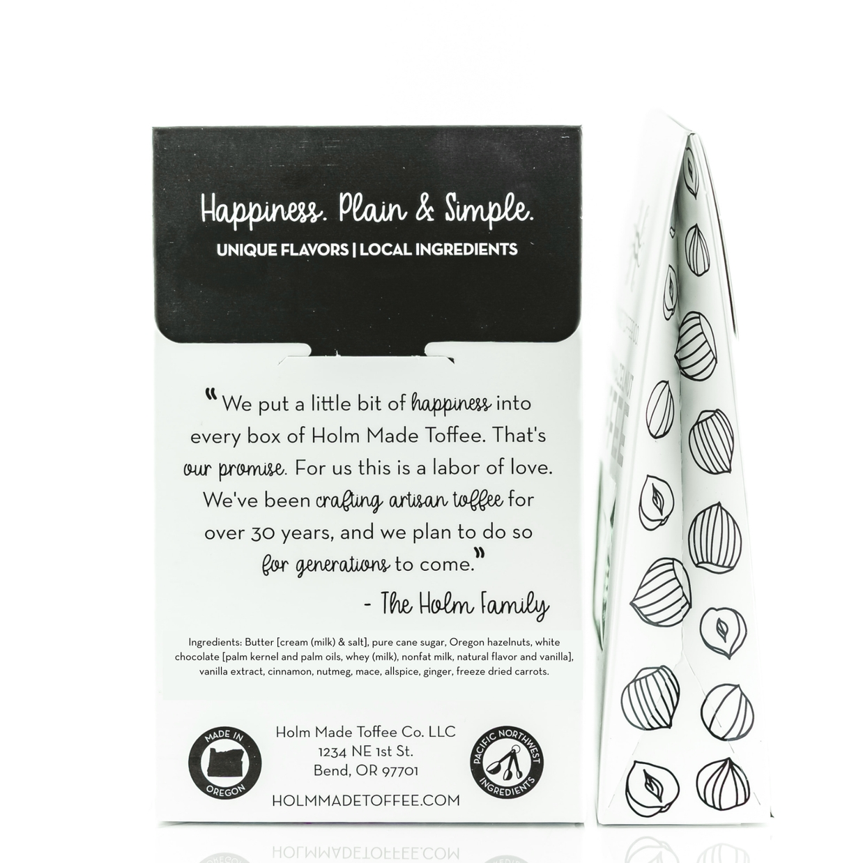 DESCRIPTION: This festive Easter treat is sure to have you hopping! Unique, unexpected...and delicious. These award winning toffee topped with creamy white chocolate, baking spices, and freeze dried carrots. Finished off with roasted Oregon hazelnuts. It's sure to be a crowd pleaser this Easter! Contains no gluten, soy, corn syrup or preservatives. It's Happiness. Plain & Simple! Each bag contains 4oz and is made with high quality, locally sourced ingredients. Shelf life is 6 months, with clearly marked 'best by' dates on each unit. Best if kept cool and dry to maintain maximum freshness and 'crunch factor'.