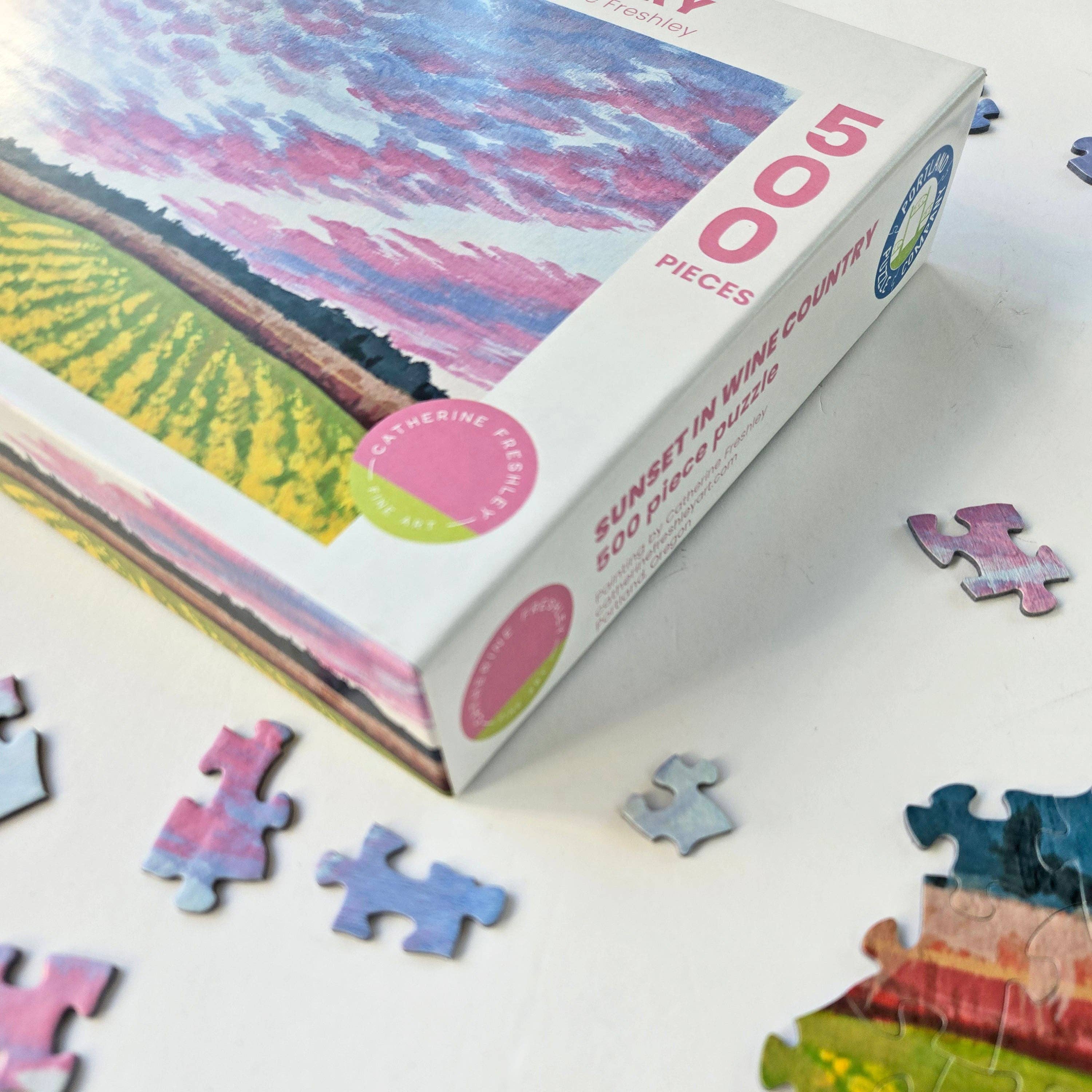 DESCRIPTION: This is a puzzle featuring Catherine Freshley's painting “Sunset in Wine Country,” based on a photo she took near Newberg, Oregon, in Willamette Valley Wine Country.