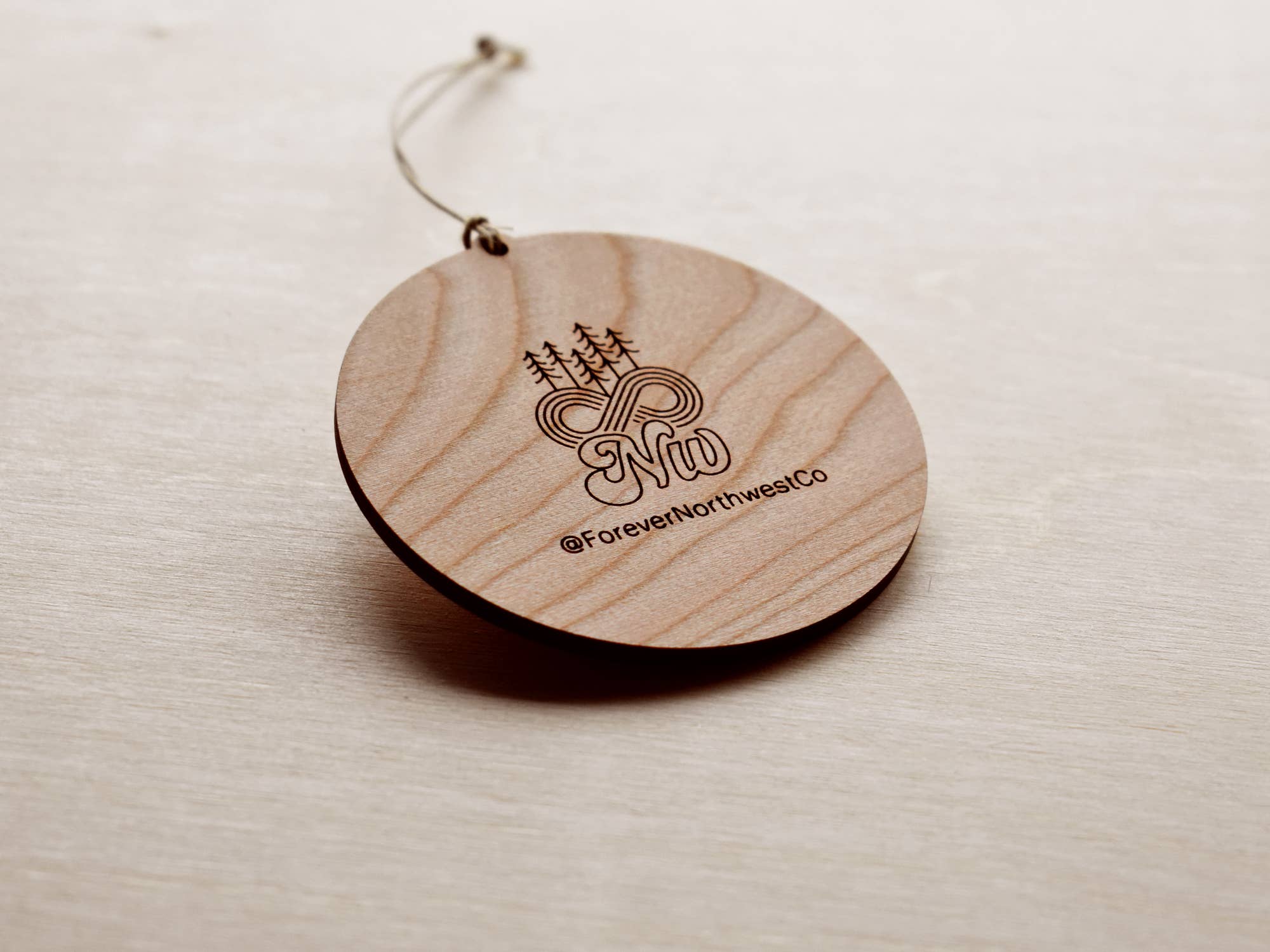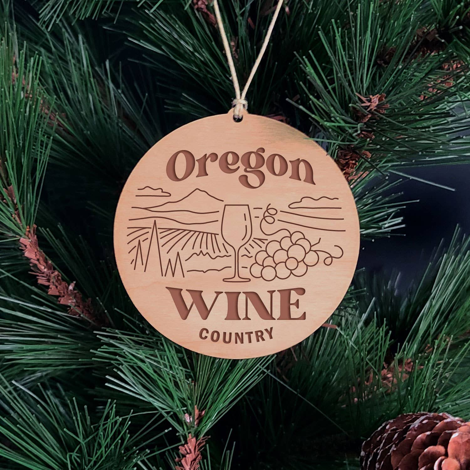 DESCRIPTION: This wooden ornament features rolling hills, Mt. Hood, a wine glass, some grapes and the words "Oregon Wine Country" and hangs from a hemp string!