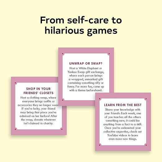 DESCRIPTION: Forget “girls’ night out”—sometimes staying in is even better. From silly to sincere, the activities in this sweet little box offer 50 fabulous ways to connect with close friends in the comfort of your own homeSIZE:2 ¼ x 2 ¼ x 1 ¼ inches