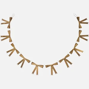 DESCRIPTION: Classic bows with a vintage-inspired brass finish make the Gold Bow Metal Garland a timeless, heirloom-quality decorative style to bring out year after year for the holidays. Oxidized sheet metal is formed into dimensional, perfectly tied bows that are linked together with small jump rings. Layer multiple strands of this 72-inch-long garland around the Christmas tree, or layer in with fresh greenery on the mantle for a timeless holiday look.