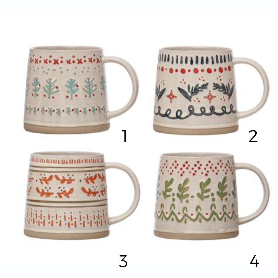 DESCRIPTION: Get cozy with a cup of cocoa this season with these adorable Hand-Stamped Stoneware Mugs! Choose from 4 super cut holiday-themed patterns!