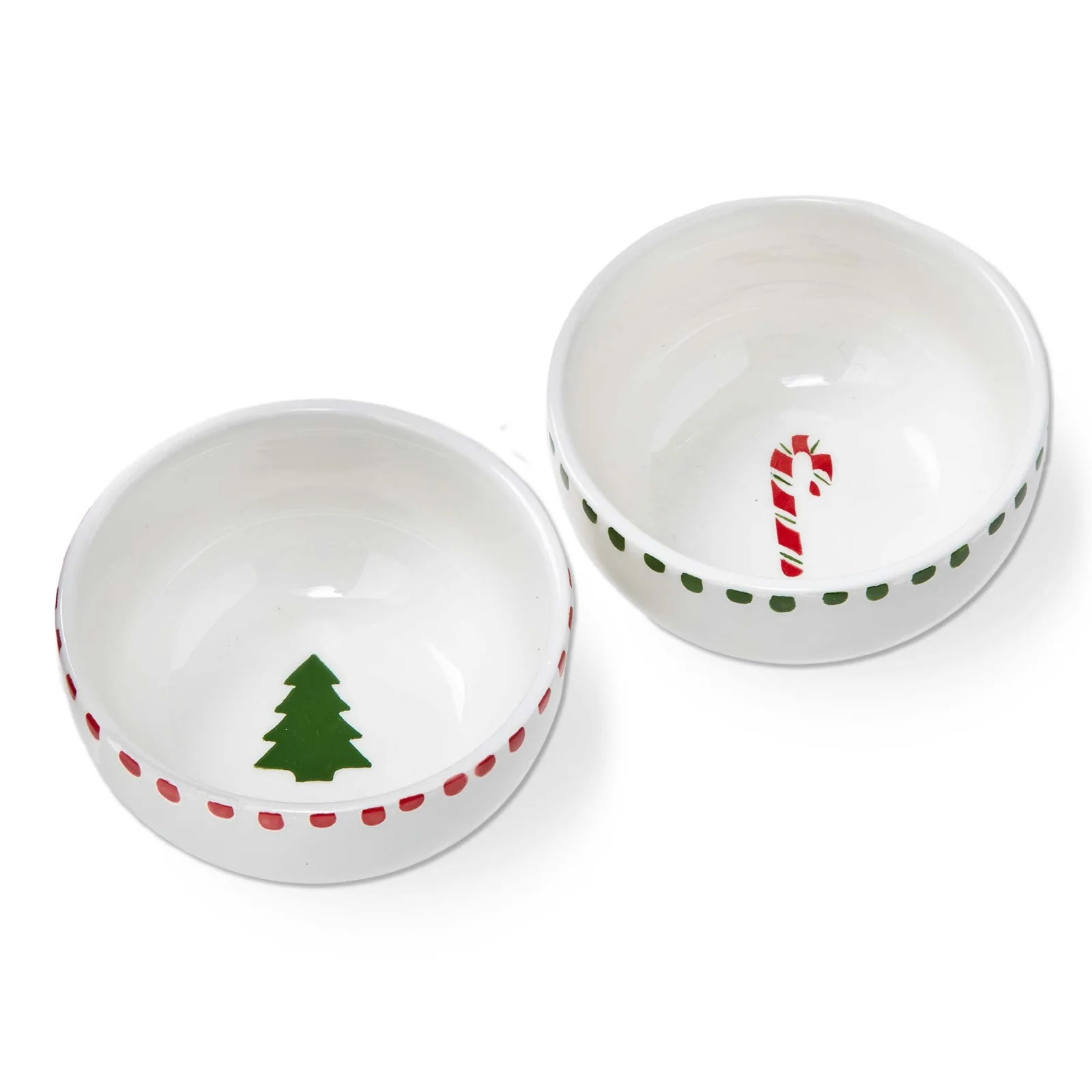 DESCRIPTION: Add a touch of holiday cheer to your table with these festive Holiday Cheer Dip Bowls. These earthenware bowls feature a classic white design with one bowl featuring a Christmas tree and the other a candy cane. Perfect for serving dips, sauces, or snacks. Each sold separately!