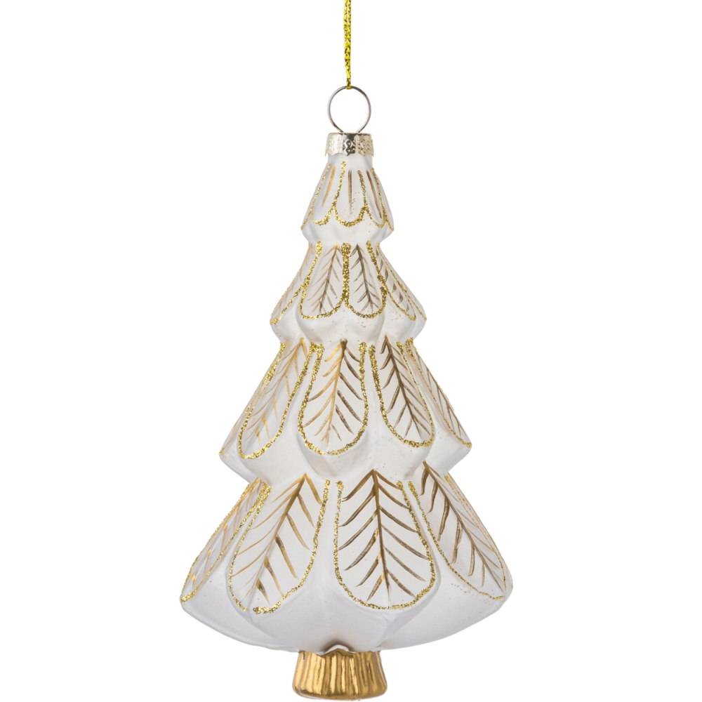 DESCRIPTION: Blown glass tree ornament, translucent matte white with gold branches.