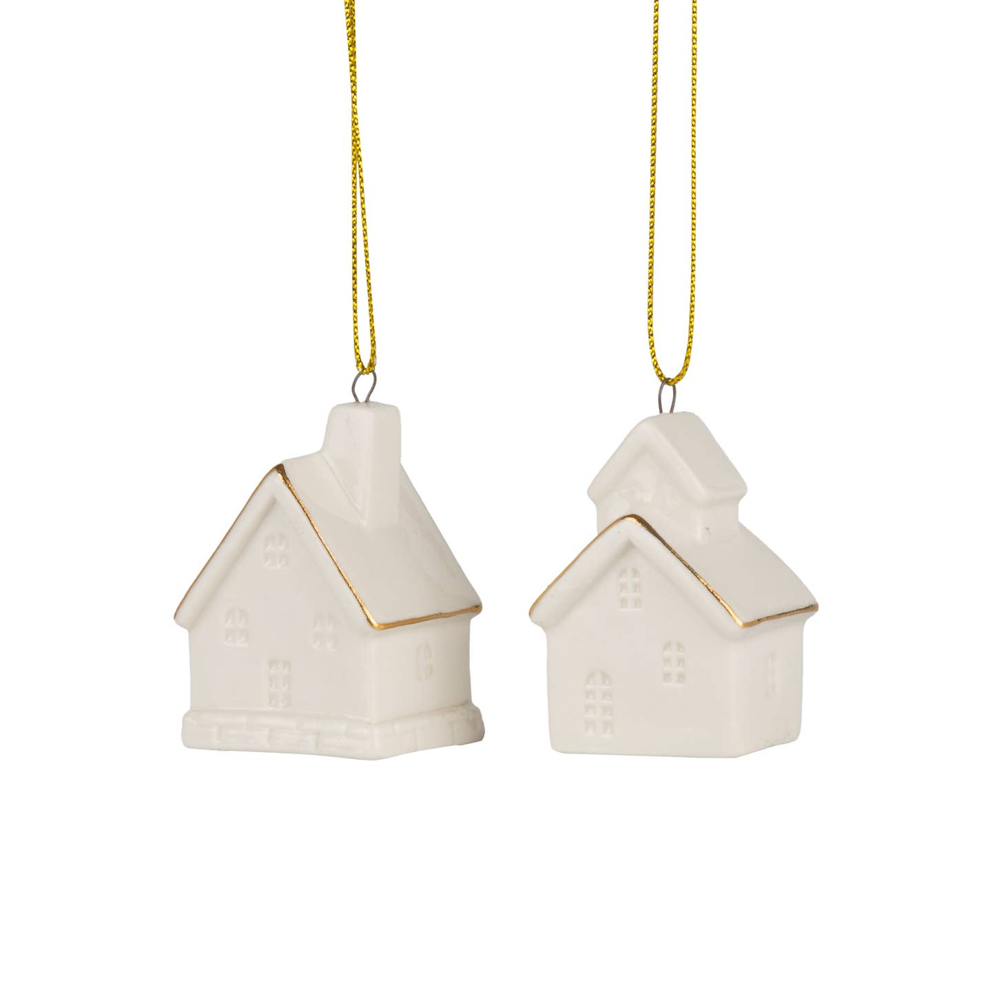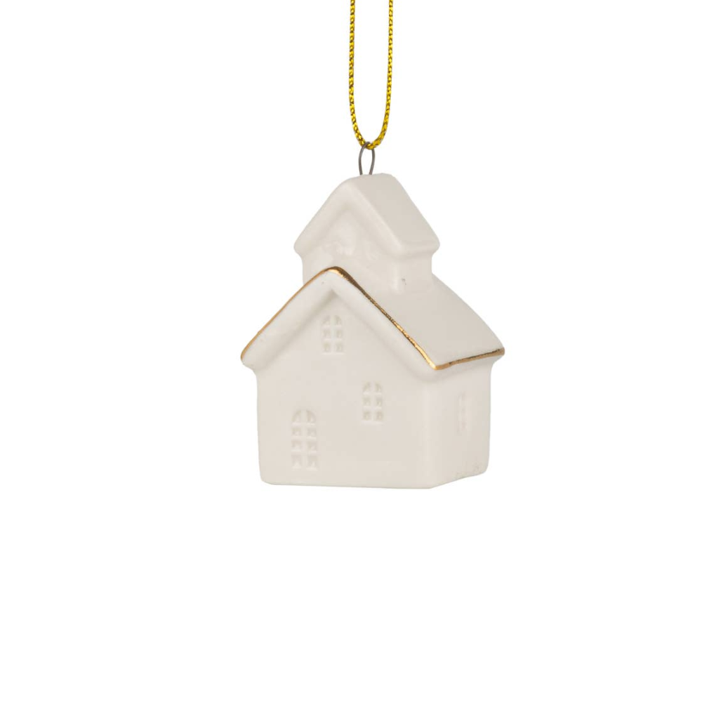 DESCRIPTION: Capture the nostalgic and simple charm of old schoolhouses with these white ceramic schoolhouse ornaments. Comes in 2 styles and both feature a beautiful gold accent trim.