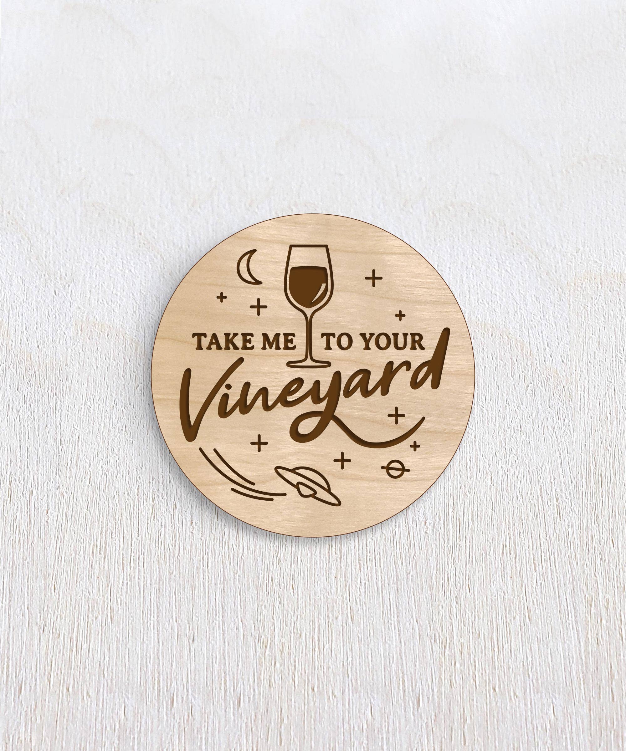 DESCRIPTION: Wooden magnet featuring a wine glass, stars, galaxy, moon, spaceship and the words "Take Me to Your Vineyard".