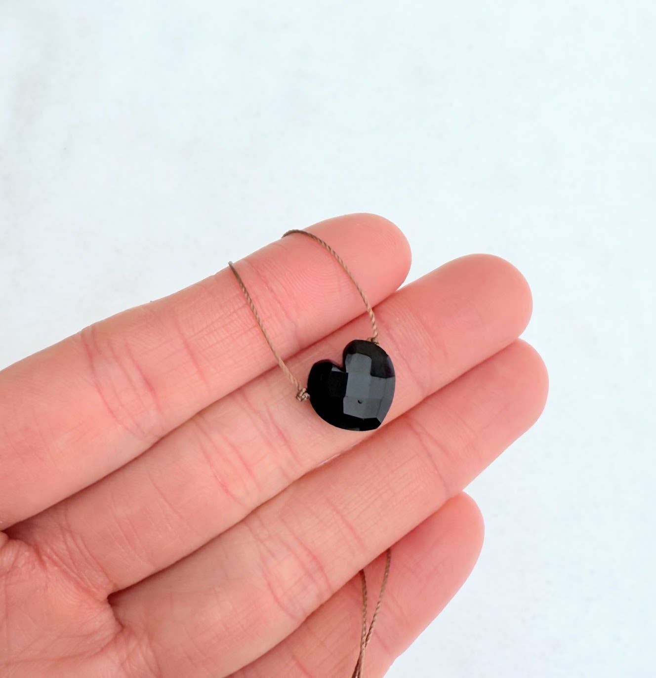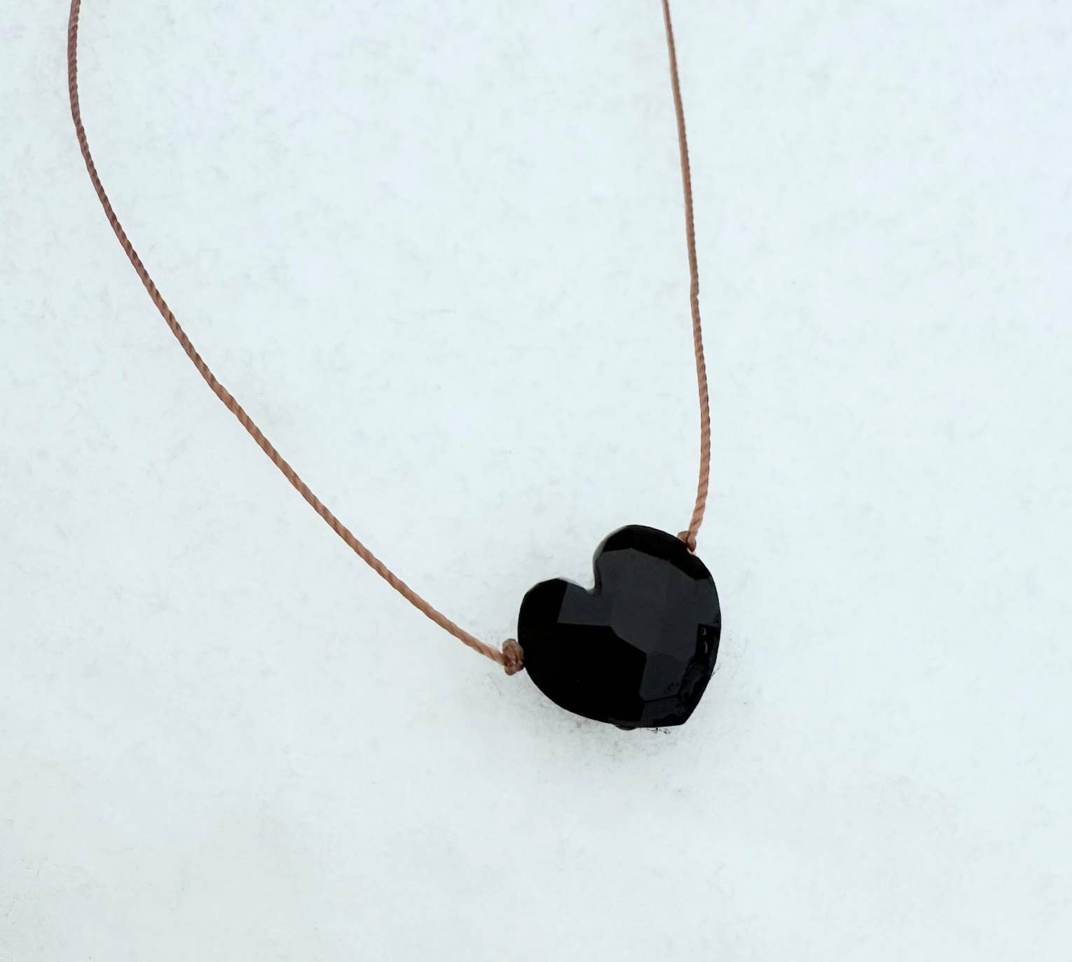 DESCRIPTION: Black onyx faceted gemstone heart, hand knotted light brown cord (heat set delicate nylon thread with strong durability and resistance to fraying), sterling silver findings. This cord is strong but also very thin and light weight, its meant to look like the stone is almost floating on the neckline.