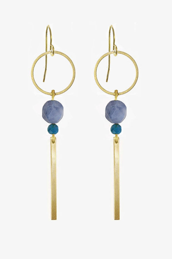 DESCRIPTION: Slender brass geometric earring with faceted quartz and apatite stones. Nickel-free.