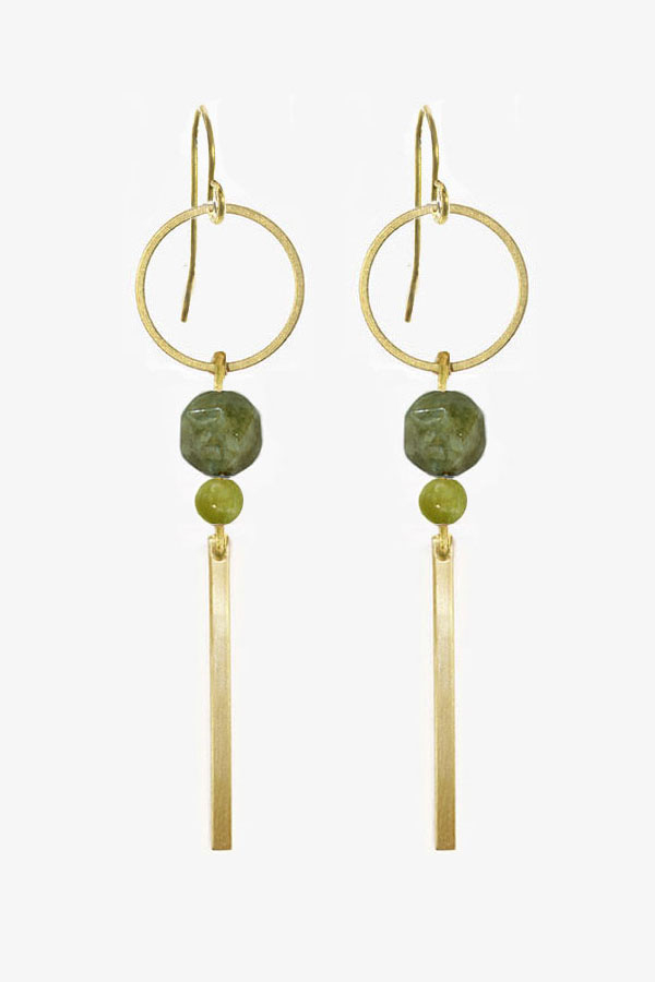 DESCRIPTION: Slender brass geometric earring with quartz and jade stones