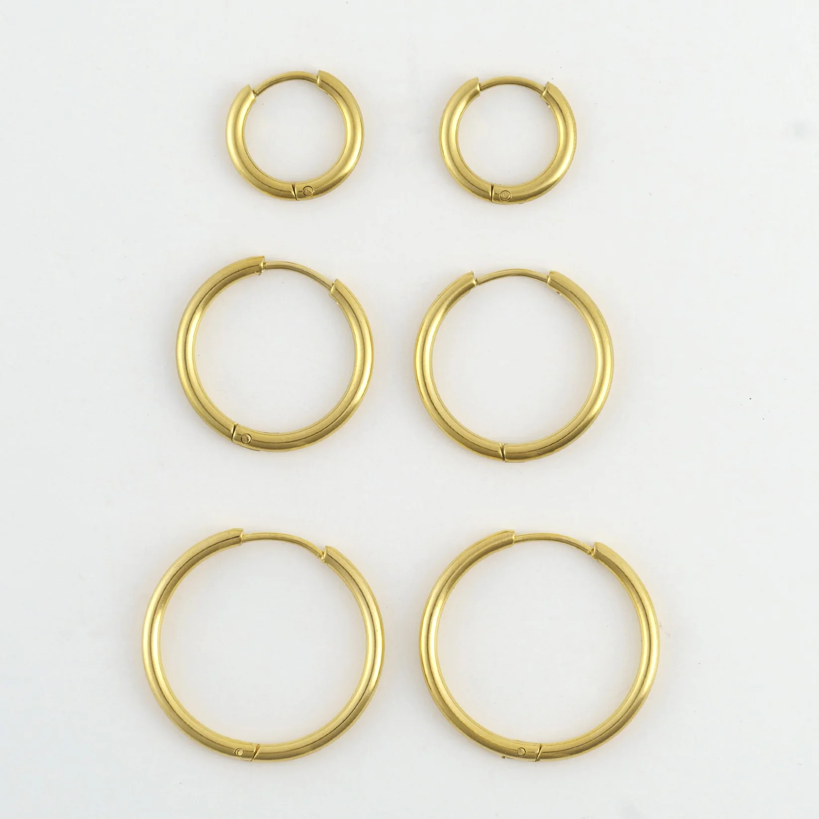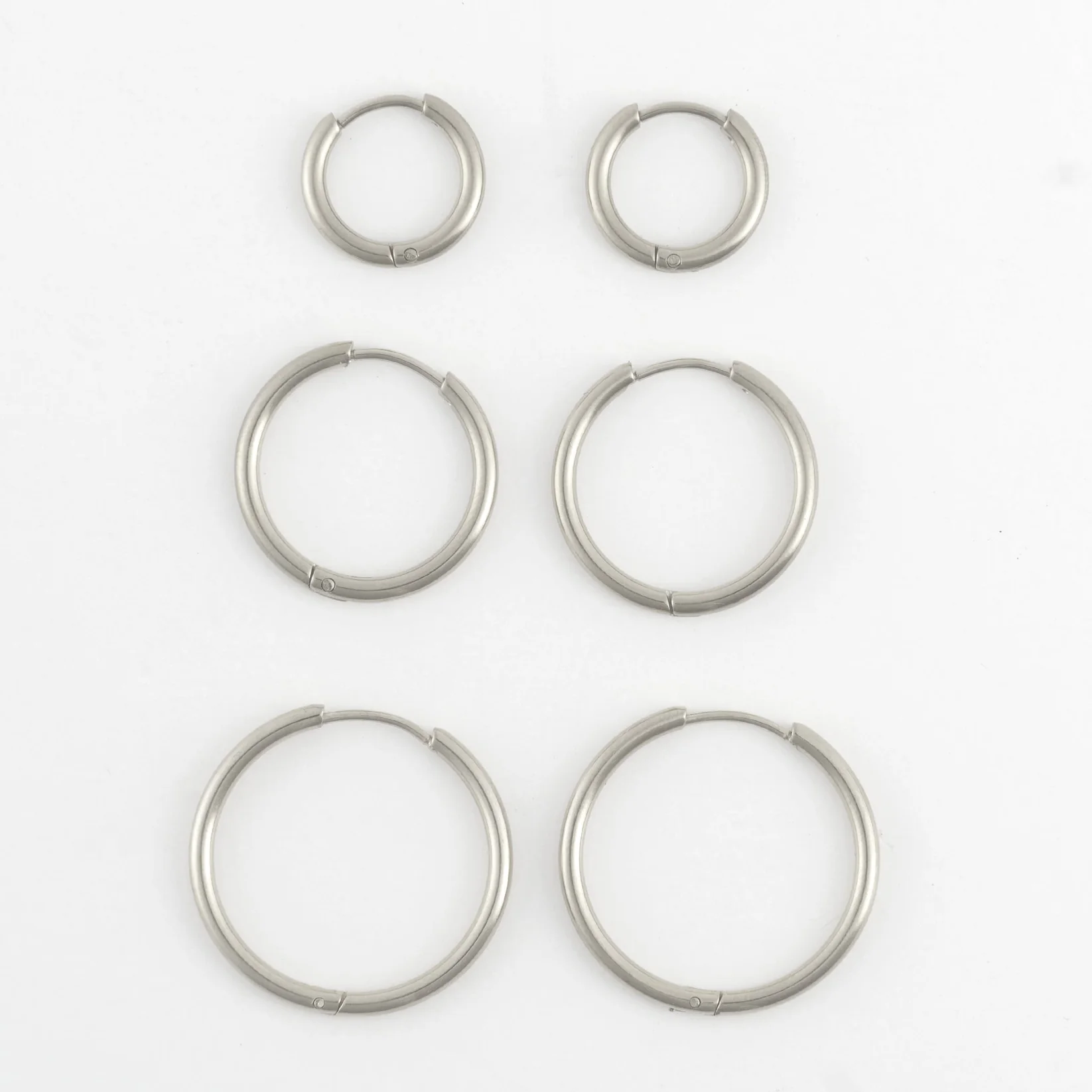DESCRIPTION: Chic and understated, the Narelle Waterproof Classic Hoop Earring Trio offers three pairs of earrings in three sizes of hoops, each in a classic, goes-with-everything silver. Go big and bold, or keep it tiny and minimalistic, the options are endless with this versatile set! Waterproof, stainless steel plated, and made with a specialized PVD technique to withstand the rigors of life, from swimming and showering to sweating through your most intense workouts, all without ever losing its shine.