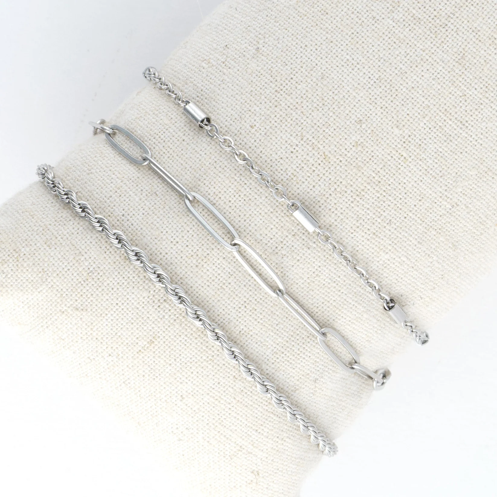 DESCRIPTION: A modern take on classic designs! The Narelle Waterproof Twisted Chain Bracelet offers three bracelets in trendy Paper Clip, Twist, and Dainty Chain designs. Wear them together as part of a stack, or on their own for a delicate, minimalist look. They styling options are endless! Waterproof, stainless steel plated and made with a specialized PVD technique to withstand the rigors of life, from swimming and showering to sweating through your most intense workouts, all without ever losing its shine.