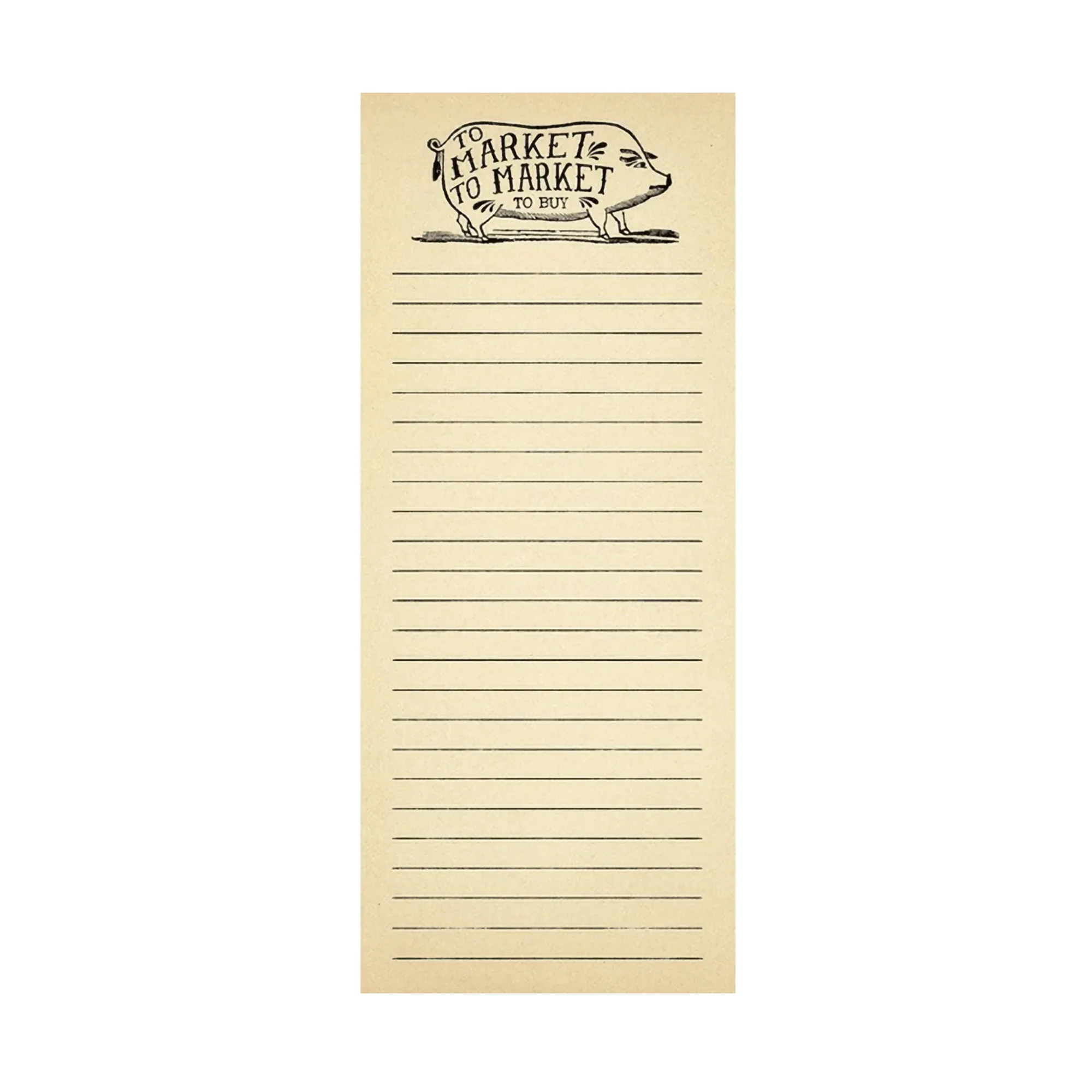 DESCRIPTION: This lined skinny notepad features a sweet pig at the top with "To market, to market, to buy" written inside. Perfect for writing your weekly grocery list, our To Market Skinny Pad will bring a smile to your face every time you use it! Pages can easily be torn off and stuck to a fridge or tucked into a notebook or planner.