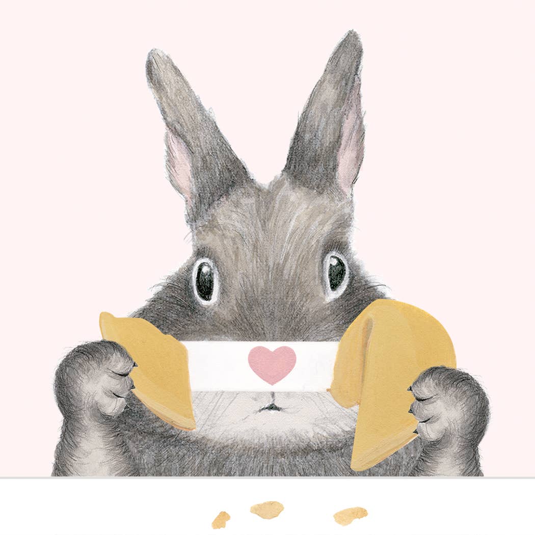 DESCRIPTION: A hand drawn bunny holding a fortune cookie with gold foiled text that reads "I'm so Fortunate that You are my Mom".