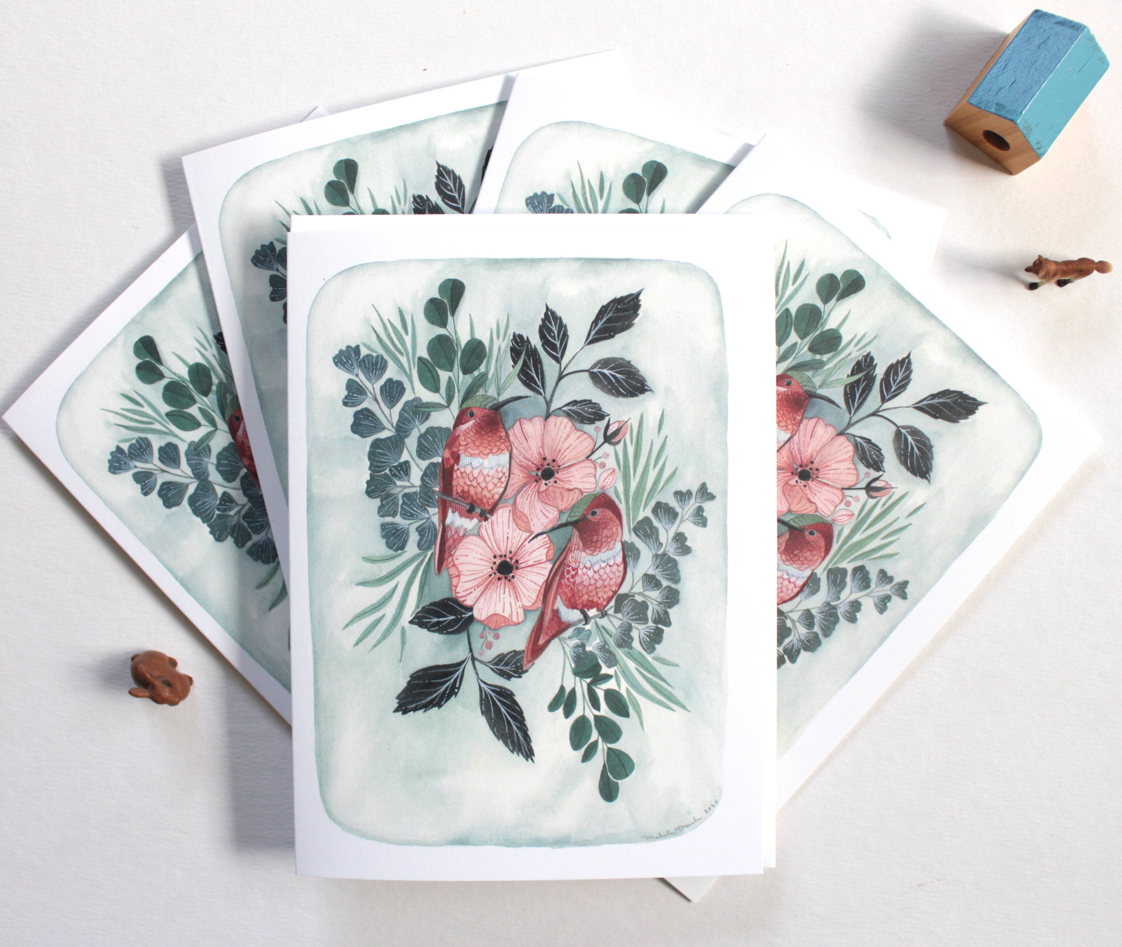 DESCRIPTION: Send a message to a loved one with this blank card with an illustration of a two little hummingbirds on the front. | Printed on a sturdy, card stock paper. | Blank inside. | Comes with a single white envelope within a protective plastic sleeve.