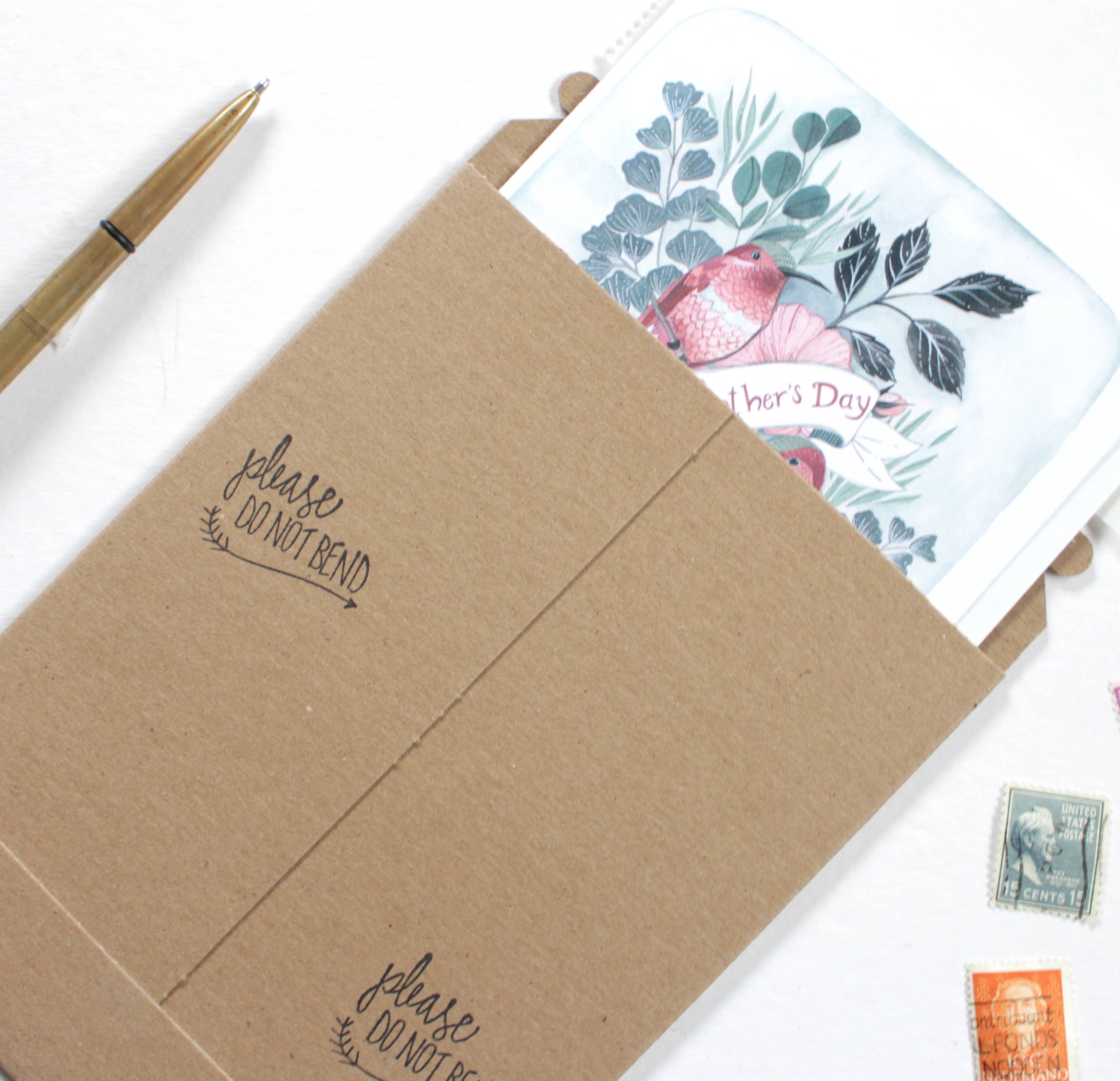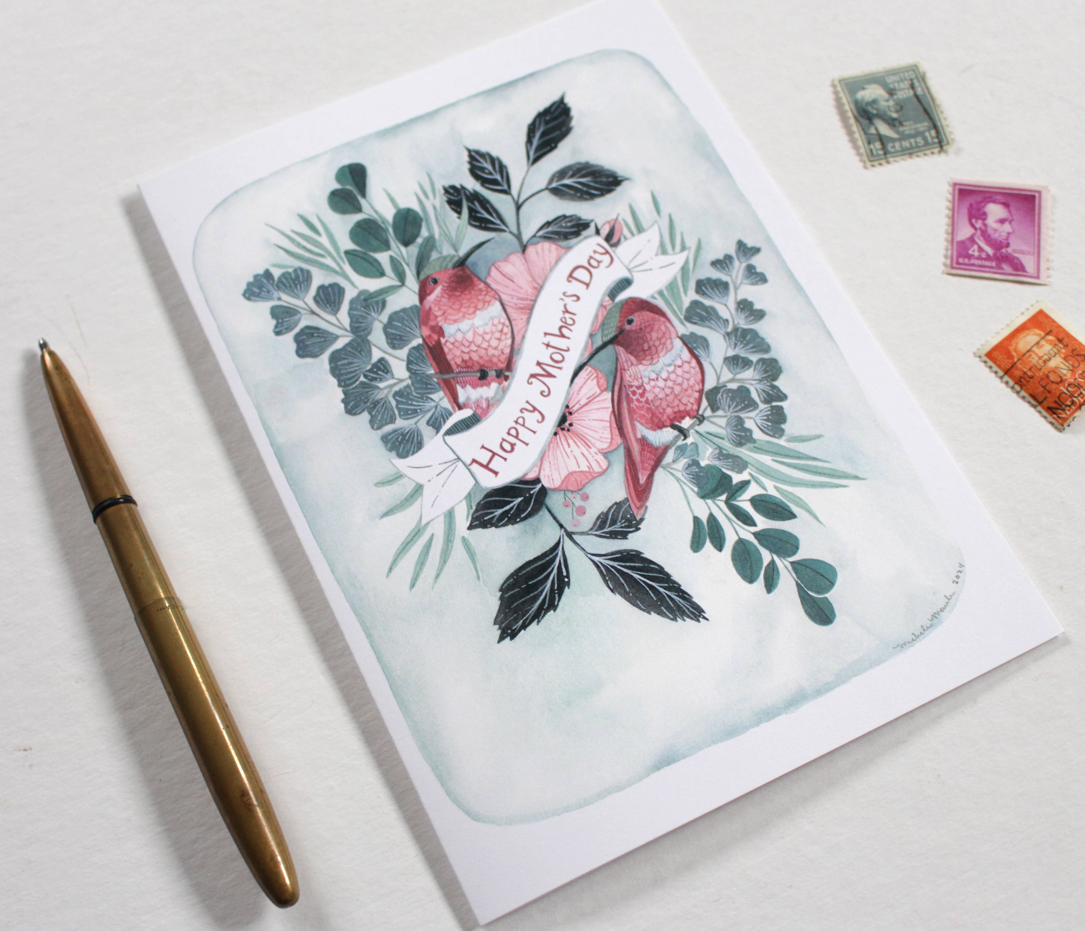 DESCRIPTION: Blank Mother's Day card with two hummingbirds. Printed on heavy card stock paper. - Comes with a white envelope. - Packaged with a protective plastic sleeve.