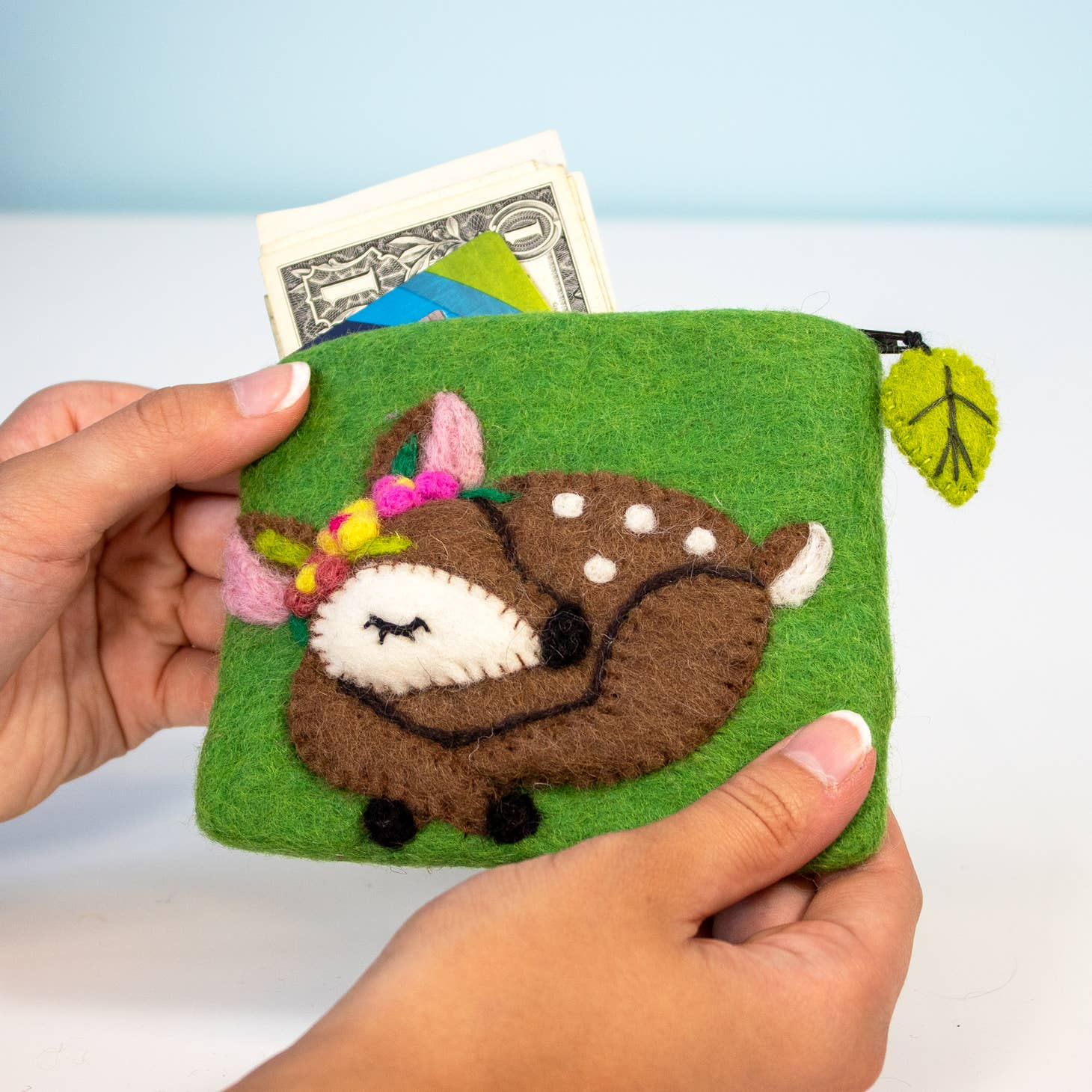 DESCRIPTION: We bet you'll be fawning all over this fun little coin purse and the best part is, it won't cost you a lot of DOE! Handfelted with 100% natural wool by a Fair Trade production group in Nepal. Made with a high quality YKK lead free zipper. Convenient size and lined with black cotton. Features a charming felt zipper pull and delightful handcrafted details. An original Wild Woolies design, member Fair Trade Federation.