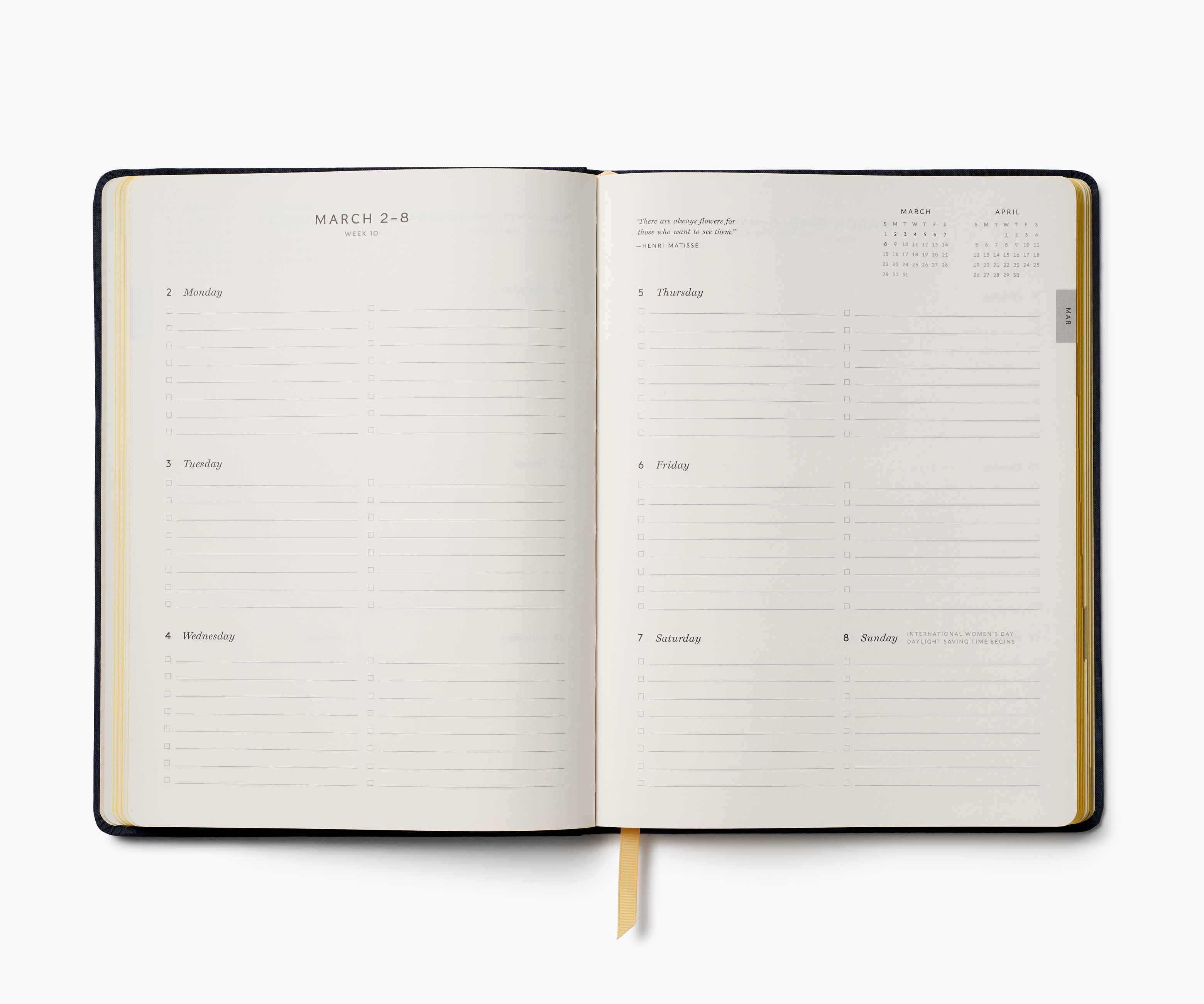 DESCRIPTION: A daily essential with keepsake quality. This fabric-wrapped planner features delicate embroidery, gold foil details, and a gold elastic closure, as well as weekly and monthly views, space for notes and to-dos, and a list of celebrations. Planner spans January - December 2026.