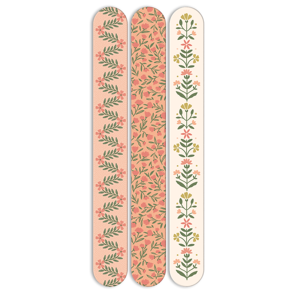 DESCRIPTION: Add a little beauty to your nail care routine with our fashion files. Lovely floral-themed designs stand out in your makeup bag or drawer. Set of three double-sided nail files!