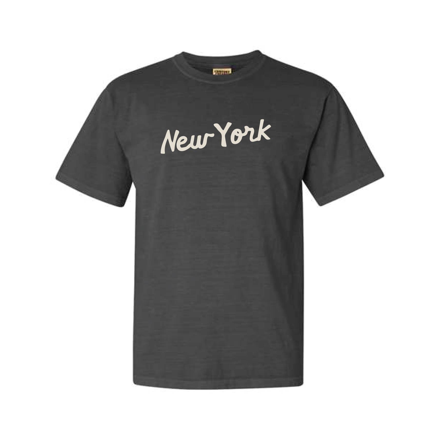 DESCRIPTION: Denim colored Comfort colors t-shirt with featuring "Newberg" in script cream font. Features a relaxed fit, ribbed collar, shoulder taping, and twill label. Garment dyed for that lived in feel and almost no shrinkage at home.
