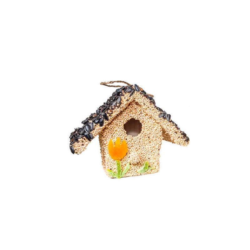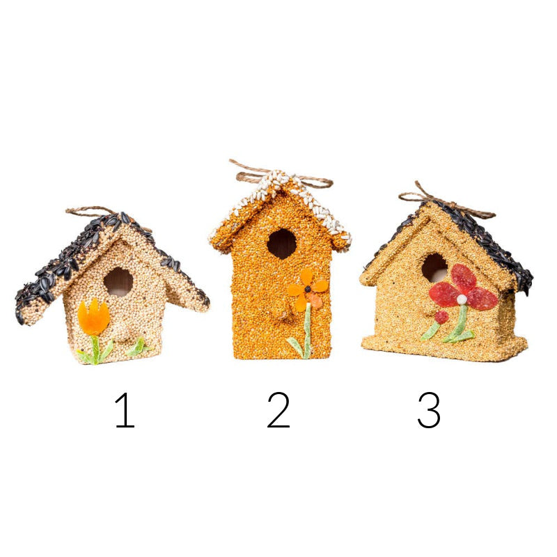 DESCRIPTION: These three adorable cottages are a sweet seed treat at a price that can’t be beaten. Hand decorated with millet, black oil sunflower, flax, canola, apricot, strawberry, kiwi, and blueberries. Under the seed and decoration is a small ornamental wooden birdhouse.