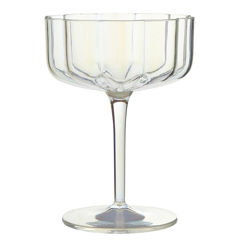 DESCRIPTION: Step up your glassware game with these beveled champagne coupes! A great gift for anyone looking to elevate their glassware collection. Hand Wash Only. Do Not Microwave. Available in pink and iridescent.