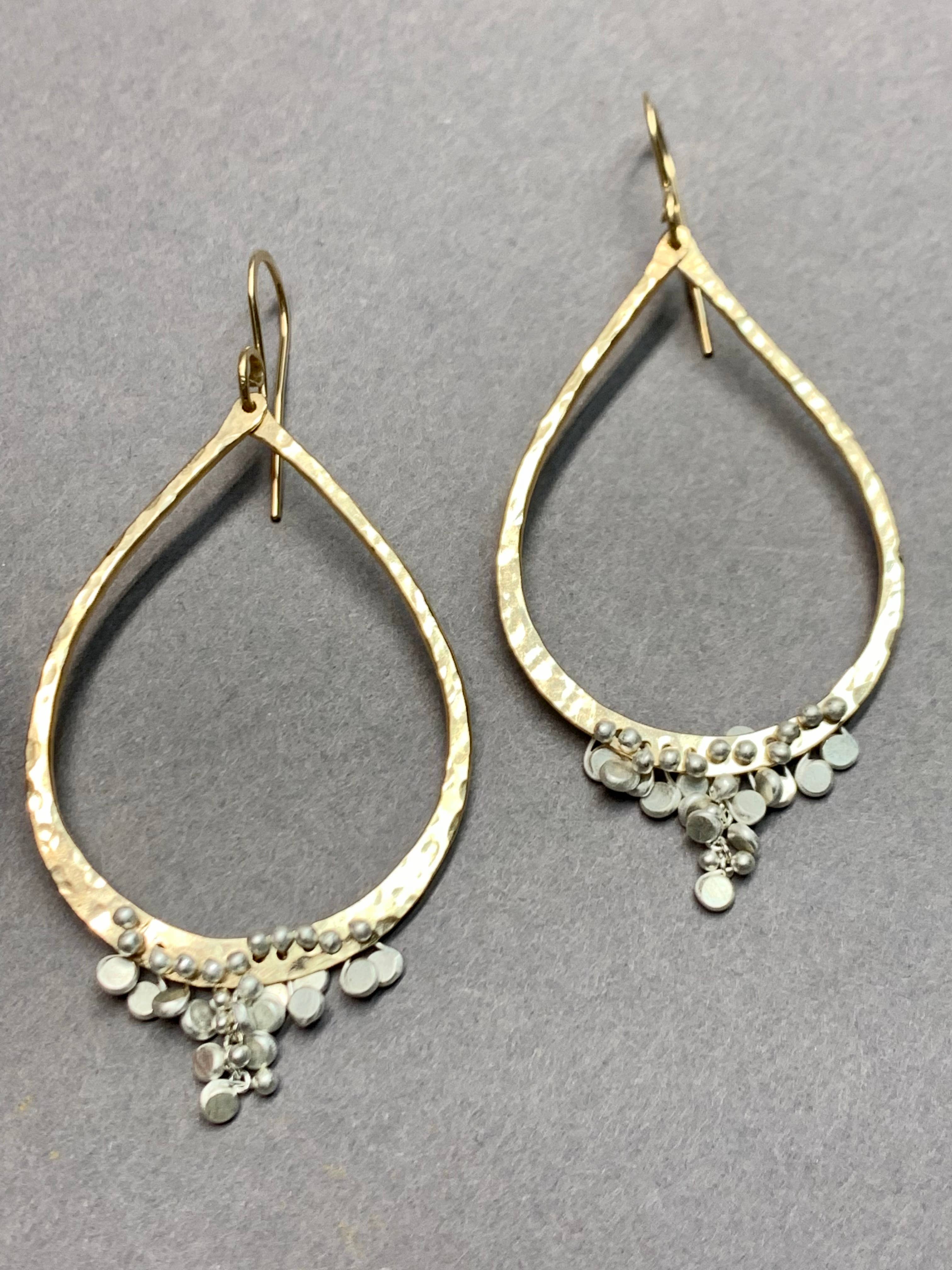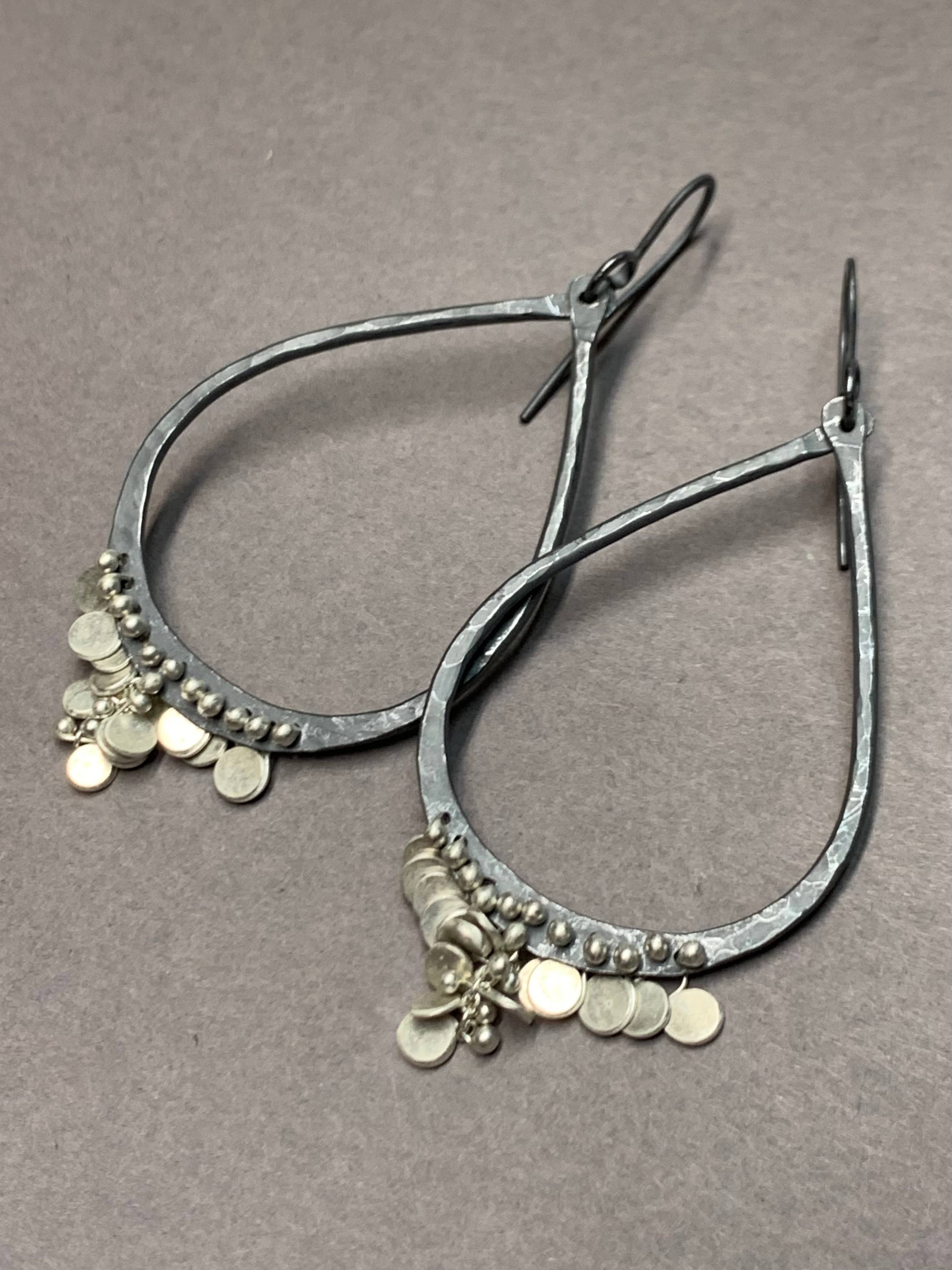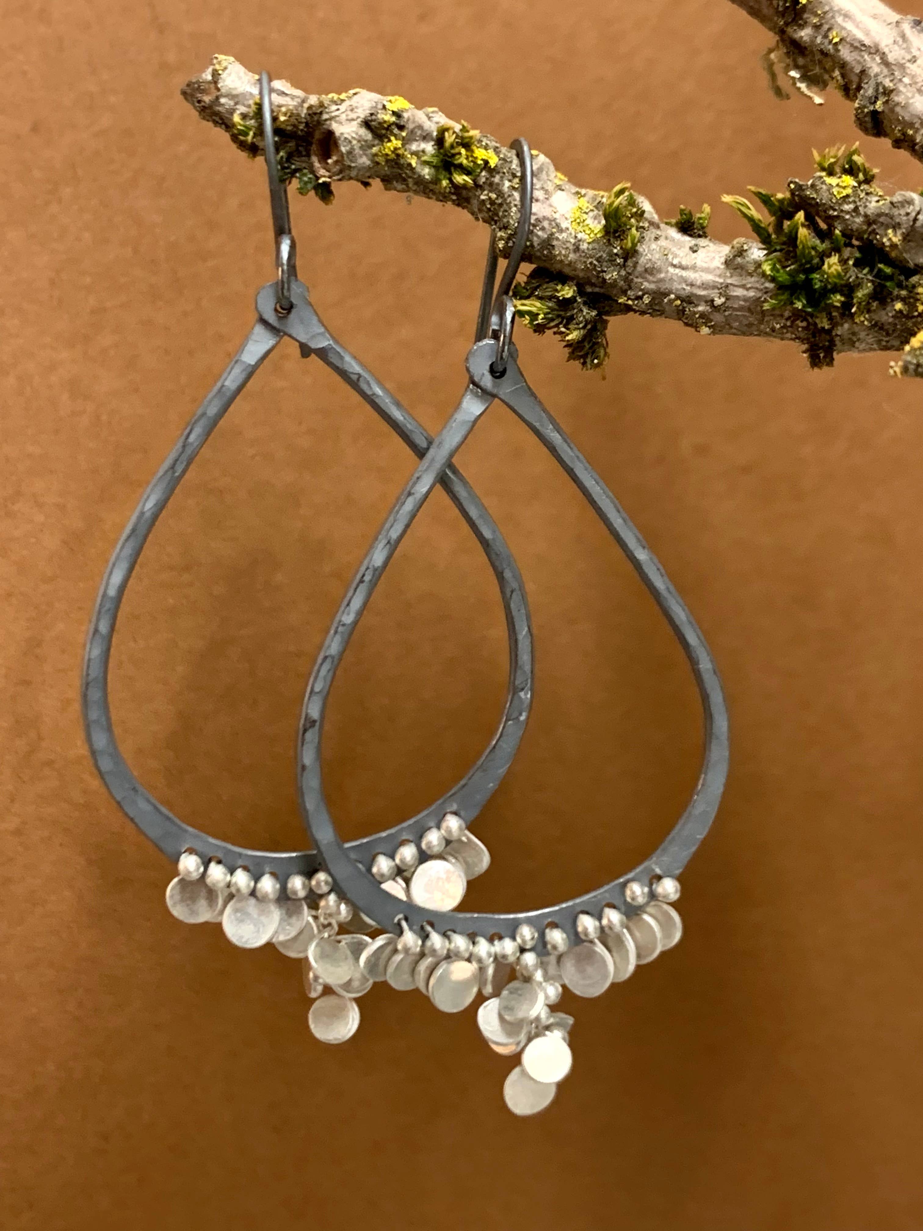 These beauties are finely handcrafted and thoughtfully designed to be light with movement that show off a unique earring and you. They are forged precious metal with tiny kinetic sterling silver discs (confetti). From the top of our ear wires to the bottom of the cascading discs, these earrings measure 2 1/2 in. long X 1 1/4 in. wide. This is why our Earrings are a favorite… ♥Durable- Sturdy yet delicate. ♥Unique metalwork design and craftmanship. ♥Comfort without compromising style and grace. ♥Ethically handmade ♥Versatile- can be worn with lounge wear or a dress Will deliver understated elegance. These clean lines will be your go-to that pull it all together. Hammered metal adds some shimmer. French ear wires. *Finishes: SS- All Sterling Silver, OXSS- Oxidized Black and Silver, GF- 14kYellow goldfilled and Silver, RS- 14k Rose goldfilled and silver, GFOX- 14kYellow goldfilled and Oxidized black silver