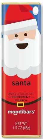 Moodibars® Santa 1.5oz - Peppermint Crunch Dark Chocolate Bar Bring some joy to your friends, family, or colleagues this Holiday season with our adorable and delicious Moodibars® - pure Belgian chocolate crafted with yummy ingredients to bring joy to the heart of even the most die-hard Scrooge. Perfect for stocking stuffers... or to treat yourself!