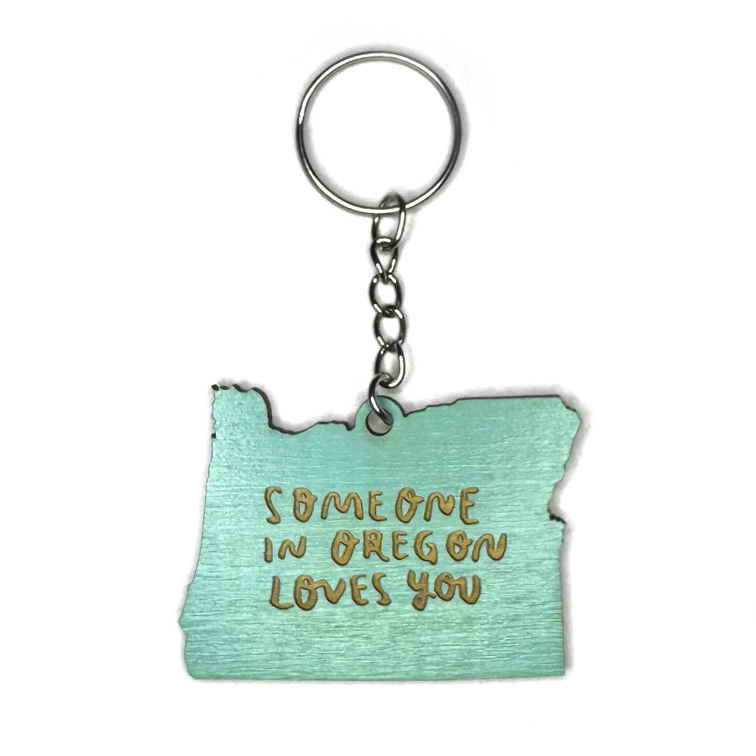 Spread the Oregon love far and wide with a handcrafted keychain! Laser cut wooden keychain in the shape of Oregon engraved with the words 'Someone in Oregon Loves You' in our signature handwritten font. • Made of hand-painted 1/8" baltic birch plywood. • Available in our array of colors including Aqua, Red, Natural, Olive, Mustard, Light Pink, Sage, Purple and Teal. • Metal keyring attached with a 1" chain. • Keychain measures approximately 2.2" x 1.6". • Unpackaged