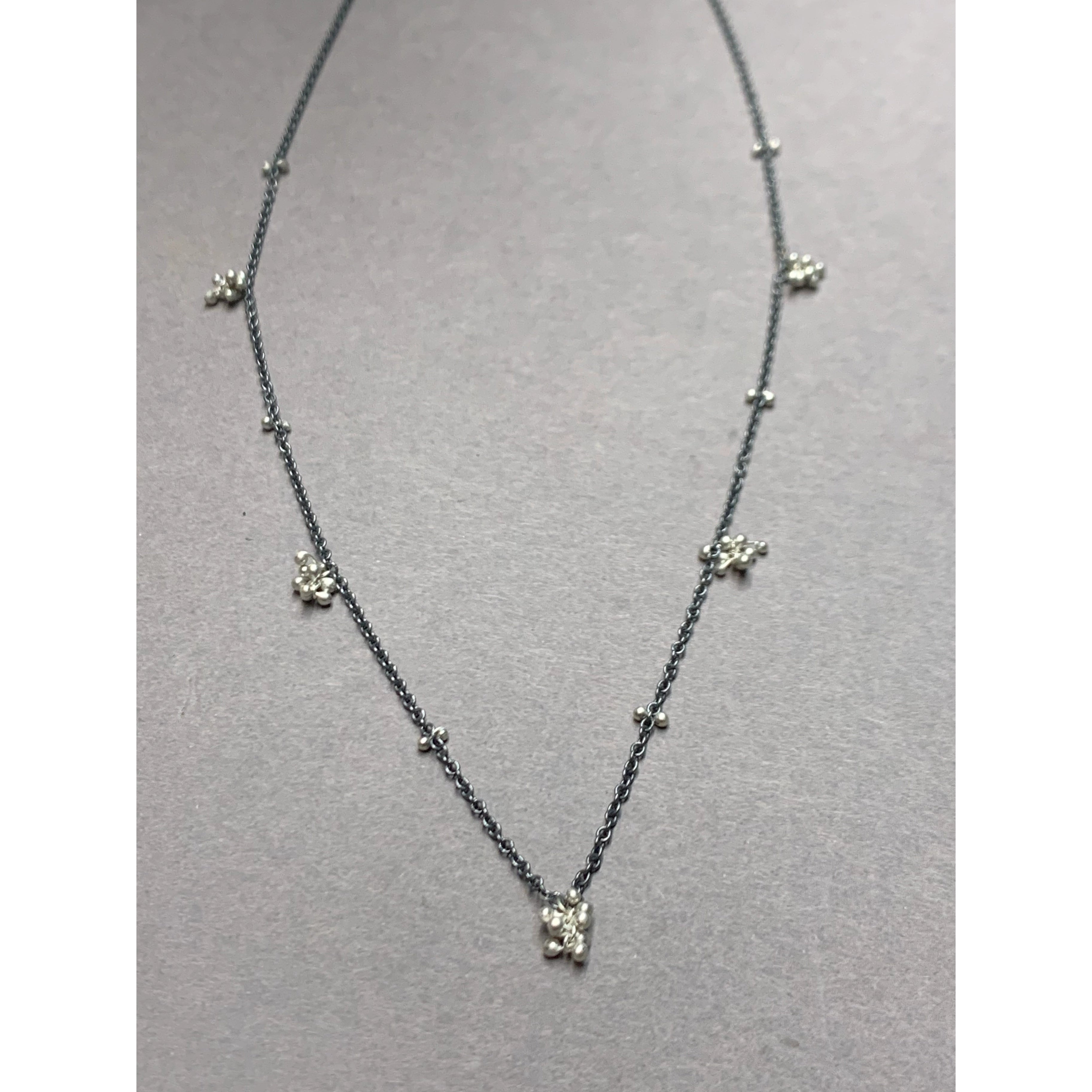 DESCRIPTION: Precious metal cable chain is embedded with tiny silver balls meticulously torched into place called caviar metalwork. A small concentration of these tiny balls is dispersed throughout the necklace. This necklace reminds us of tiny white flowers called baby's breath. Hook and eye sterling silver clasp. Sturdy and eye catching craftmanship. Unique metalwork design and technique. Workmanship guarantee. Recycled Silver and Gold